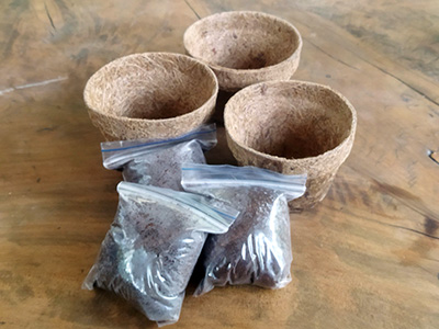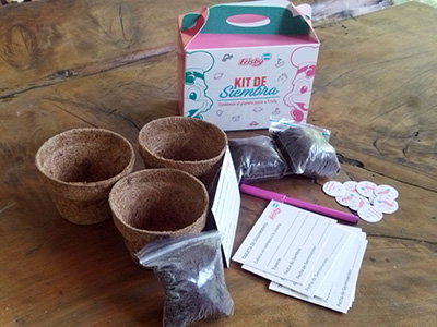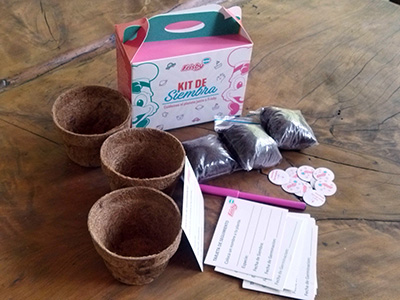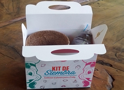 Kit de siembra en caja tipo lonchera ideal para regalo corporativo que contiene 1 matera de fibra natural de coco, 3 monedas semillas, 1 bolsa de sustrato de germinación, 1 plumón, 3 tarjetas de seguimiento y caja con diseño personalizado.