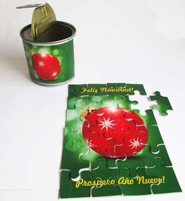 Rompecabezas sembrables y germinables personalizados con su diseño o mensaje en la etiqueta de la lata y en el rompecabezas. Un novedoso regalo en lata ecológica que habla muy bien de la marca.